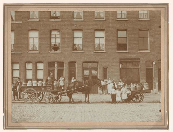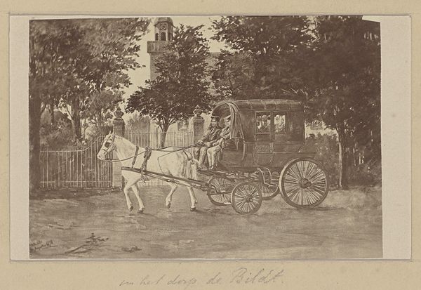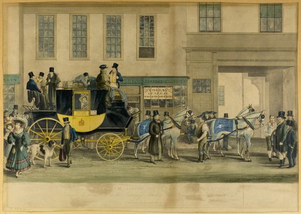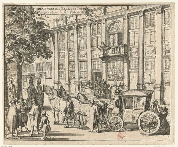Curator: Stepping up close to this print at the Rijksmuseum, we find ourselves contemplating “Pamela vertrekt in een koets naar Lincolnshire,” an engraving by Antoine Benoist, possibly created between 1745 and 1747. It depicts a scene teeming with social implications and the visual language of its time. Editor: My first impression is that it's wonderfully busy, almost a snapshot of daily life, but tinged with a sort of bittersweet departure. The fine lines create a delicate, almost ethereal mood, like capturing a memory fading at the edges. Curator: Absolutely, and what's fascinating here is the subject itself: the departure of Pamela, likely from Samuel Richardson’s popular novel, Pamela. We’re witnessing her supposed farewell before being sent away, orchestrated by a character watching from a window, highlighting themes of class, deception, and female agency within 18th-century society. Editor: I'm drawn to the horses, they're so robust and full of life, pulling the carriage forward while everyone else seems caught in a moment of restrained drama. Do you think their energy hints at Pamela's inner desire for freedom? Maybe I’m projecting… Curator: It’s a beautiful interpretation! I’d say it certainly resonates. Remember that period engravings were often intended not just as aesthetic objects but as vehicles for social commentary and narrative dissemination. Notice the intricate details in the architecture versus the emotional expressions—or lack thereof—on the figures' faces, which tells us a great deal about the priorities of that time. Editor: And that woman in the window! There's something vaguely menacing about her perch above the scene, like she's pulling the strings of Pamela's destiny. Makes me wonder about the gazes we put ourselves under and the roles we unwillingly perform. Curator: Indeed. In viewing this engraving, we're not only engaging with its immediate aesthetics but also critiquing the power dynamics reflected within and prompting conversations about the continued relevance of these narratives today. Editor: Precisely, it’s less a static image and more a launchpad for imagining the whole story around that single moment, wouldn't you agree? Curator: Entirely, and this engraving offers us not just a depiction of a departure, but an entry point into understanding the complexities of gender, class, and power embedded in 18th-century European culture. Editor: Well, now I can’t help but ponder what lies beyond Lincolnshire for poor Pamela, and maybe for us all.