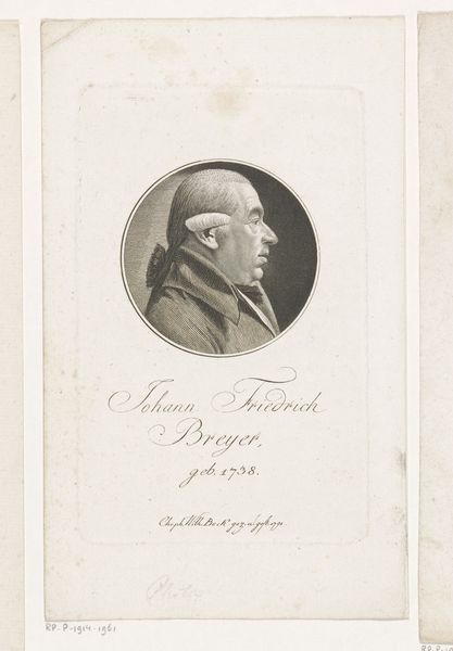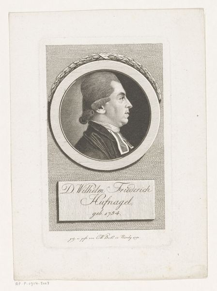Christoph-Wilhelm Bock rendered this print of Wilhelm Friedrich Hufnagel using engraving. Note the stark contrast of black lines against the stark white paper. The composition centers on the sitter’s profile encased within a perfect circle, a formal device that lends the portrait an air of classical purity. Bock masterfully uses line and texture to model the face, capturing the subtle contours and textures of skin and hair. Observe how each delicate stroke works in concert to define the structure of Hufnagel’s features and the volume of his powdered wig. The inscription below the portrait is not merely descriptive but functions as an integral part of the design, mirroring the curve of the portrait above and anchoring it. The text below the portrait lends balance to the composition, and emphasizes the formal elements which contribute to its overall visual harmony. This is more than a likeness; it is a study in the art of representation itself.