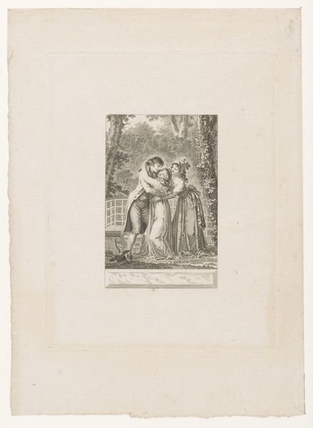Jean-Louis Delignon created this etching, “La Matrone d'Ephese,” in Paris in 1795, as part of an illustrated edition of La Fontaine’s stories. The printmaking process allows for the creation of multiple identical images, a technology that democratized art in the late 18th century, moving it beyond unique paintings or sculptures commissioned by the wealthy. Here, Delignon used etching to render a scene of classical antiquity. The stark lines create dramatic contrasts of light and shadow, giving a sense of depth and volume to the figures and architecture. Close inspection reveals a network of fine lines incised into the metal plate. Acid would have been applied to bite into these lines, allowing them to hold ink. The plate would then have been pressed onto paper, transferring the image. The precision and detail achieved through etching speaks to the skill and labor involved in this printmaking process, a craft tradition that bridges artistry and industry. The story being told here would have been available to a wide audience through the miracle of mechanical reproduction.