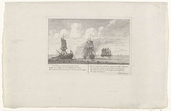 Curator: I’m glad we can examine Carel Frederik Bendorp's etching, "Hoekerschip Vrouw Machtelyna na het gevecht met Engels fregat Diamant voor Curaçao, 1782." What grabs your attention? Editor: Well, first, I'm struck by the starkness of it. Being a monochrome etching from 1782, there's this feeling of distant history, and the choppy waves make the scene quite dramatic. What details jump out at you? Curator: I am interested in how the print was made. Note the labor required to produce those fine lines, a stark contrast to contemporary methods of production. Also consider its purpose: these prints disseminated images of naval battles across a burgeoning consumer market. Did this distribution influence public perception of Dutch maritime power, shaping political discourse? Editor: That’s a great point. So you’re saying the materiality of the etching, its reproducibility, and how it's spread impacted social values, especially perceptions of Dutch colonial strength? Curator: Precisely! The paper, the ink, the very act of etching – they are not neutral elements. Each tells a story about 18th-century society, about the artist's role as a recorder, and the printmaker's role as a manufacturer, each responding to public demand. Editor: I see how your analysis pulls back to the physical creation and dissemination to consider a cultural narrative. How can appreciating that manufacturing aspect change how we see other art forms of this era? Curator: Paying attention to production—who funded it, how materials were sourced, and who had access—shifts us from celebrating individual genius toward analyzing systems of patronage and power, shaping our view of artistic "value." Editor: It’s helpful to remember that prints like this existed within a network of material and political conditions. Thanks. Curator: Understanding the material conditions gives access to understanding art’s societal position; considering the work and means brings those positions to light.