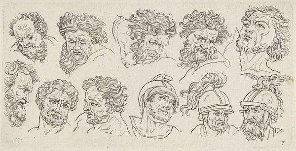 Curator: This drawing is titled "The Holy Ghost Enlightens the Apostles" by James Ensor, created in 1921 using ink. It’s a striking piece. What’s your immediate reaction to it? Editor: I’m struck by the texture. The density of the ink strokes gives the image a raw, almost feverish quality. You can practically feel the paper. Curator: Indeed. Ensor’s use of ink exemplifies the Expressionist interest in raw emotion made visible through process. Look at the way he's applied it – frantic lines building up these intense, almost grotesque faces. And given the date, it sits squarely in a post-war milieu hungry for spiritual solace but also deeply marked by trauma. Editor: I think the placement of the ghostly figure at the top suggests more than solace. There’s something unsettling about the arrangement. Their upturned eyes meet in unison, it almost mocks the historical depiction. Did the consumption of mass art contribute to Ensor's interpretation? Curator: It’s definitely a pertinent inquiry, the figures become more cartoonish as Ensor moved away from painting, and shifted toward accessible pen-and-ink drawing. The piece might be seen as critical to institutional faith as well. Editor: True, and considering the art market and its developing institutions after the First World War, such accessible imagery made religious themes open for broader interpretation. And his means of production really leans into mass consumption through its simplistic materials. It's clearly ink on paper. Curator: Absolutely. Ensor knew exactly what he was doing when he chose such humble materials for such a weighty subject, disrupting notions of high art versus low art by imbuing a traditional theme with modern unease. The role of artistic labor, in making sacred images more open to a popular interpretation is also vital. Editor: Yes, the act of reproduction, how imagery reaches different audiences is essential. The materiality speaks volumes – this isn't some grand oil painting meant for a church; it's something more intimate, questioning religious spectacle for a skeptical public. Curator: Exactly, which makes the viewing experience that much more nuanced when encountering the art! It almost acts as an early meme, questioning while allowing each person their own interpretation. Editor: Right, looking at the impact of accessible spiritual figures in post-war society really allows us to examine faith and institutionalized practice today!