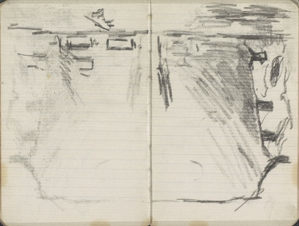 Editor: Here we have George Hendrik Breitner’s “Trampaard” from 1893, a graphite drawing on paper held at the Rijksmuseum. It’s strikingly abstract, almost like a Rorschach test. What jumps out to you when you see this piece? Curator: What interests me most is the labor evident in its creation. Notice how Breitner uses the readily available materials—graphite and lined paper, likely a sketchbook page—deconstructing the traditional hierarchy that separates "fine art" from everyday sketching. The quick, repetitive strokes suggest a process of rapid documentation. Editor: So you see value in the materials themselves, beyond just what's depicted? Curator: Absolutely. The materials and method of production challenge the notion of art as something precious and rarefied. He's capturing the fleeting moment, prioritizing the act of drawing and seeing over creating a polished product. Where was Breitner working, and what social context surrounds this particular "tram horse?" How was this horse used? Editor: So it's like the process and social use become the point? I was so focused on trying to "see" something representational. Curator: Exactly! It shifts our focus to the conditions of artistic production and consumption. Breitner, working in a rapidly industrializing Amsterdam, draws our attention to the working class. The act of sketching, almost furtively, on inexpensive lined paper, highlights this relationship between art, labor, and urban life. How might that insight reshape how we see similar sketches from the period? Editor: I never thought about the cost and accessibility of art materials being so intrinsically linked to the subject matter. Seeing it that way makes the piece much more engaging and meaningful to me. Curator: Precisely! By examining the material conditions, we gain a deeper understanding of the artist's intent and the broader social forces shaping artistic expression. It invites us to question established aesthetic values and consider art as a reflection of its time.