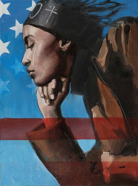 Adam Caldwell made this painting, Portrait #4, sometime in the 20th century, using what looks like oil on canvas. The way he's layered the image, a woman’s face overlaid with the American flag, it's like he's building up meaning, brushstroke by brushstroke. Looking at the surface, you can almost feel the push and pull of the brush. Some areas are built up with thick, opaque paint, while others are thinned out, transparent washes, see the contrast of the red bars with the woman's face. It's this back-and-forth, the give and take, that makes the painting so dynamic. Take a look at the lower right corner of the painting, with the fragment of text and the black cross. It’s like Caldwell is dropping clues, inviting us to piece together the puzzle. I’m reminded of Robert Rauschenberg’s collages, which blend painting and found objects to make pointed cultural commentary. In the end, it’s the painting’s ambiguity, its resistance to easy answers, that makes it so compelling.