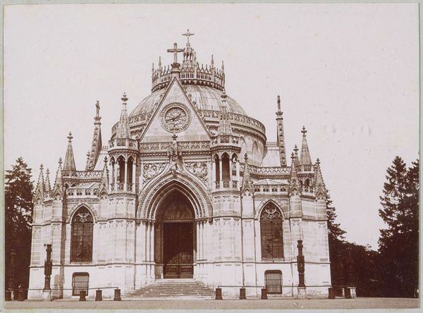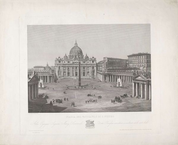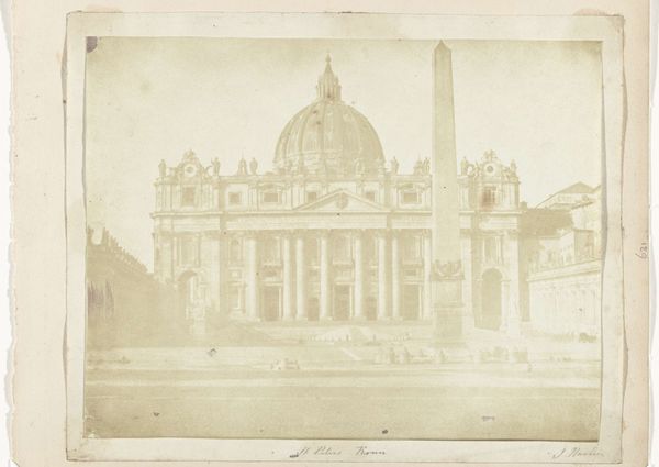 Editor: Here we have Eugène Constant's "S. Pietro in Vaticano", created between 1848 and 1852. It's a photographic print showcasing a detailed view of St. Peter's Basilica. What strikes me is the photograph's sharp focus; you can almost count every stone. What do you see in this piece, from your perspective? Curator: Its geometric rigour. Observe how Constant meticulously captures the basilica's facade, its lines and the forms all adhering to classical principles of Renaissance architecture. Consider the way the colossal dome looms, a sphere segmented by ribs, asserting a dominant verticality, yet balanced by the horizontal emphasis of the facade’s entablature. What purpose does the perspective serve here? Editor: It does seem carefully framed, almost symmetrical, to emphasize that balance you mentioned... almost staged despite it being a photograph of an existing structure. Curator: Precisely. Constant is acutely aware of how the photographic medium can translate three-dimensional space onto a two-dimensional plane. This calculated compression generates a powerful, almost overwhelming effect. The tonality of the image is quite narrow. Does it create an illusion, or enhance the subject of the architecture? Editor: Good question! The narrow tonality seems to highlight the textures, bringing forward minute details... perhaps enhancing the reality? It’s less about creating an illusion and more about documentation? Curator: Documentation elevated through conscious artistry. We appreciate how his artistic manipulation of form contributes meaningfully to understanding and aesthetic impact. Editor: It makes sense, by drawing our attention to form, this perspective makes the familiar appear novel again. Thank you!