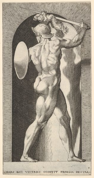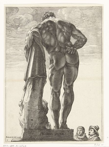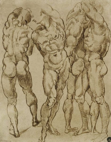 Editor: This engraving, "Anatomical Study of Three Men" by Paulus Pontius, created sometime between 1616 and 1657, is striking in its stark presentation. The figures are rendered almost aggressively, emphasizing muscle and sinew. What interpretations can we draw from its emphasis on human anatomy, particularly during that period? Curator: This piece acts as a powerful demonstration of how art and science intersect, reflecting the burgeoning interest in empirical observation that characterized the period. But more than just a neutral anatomical study, consider the politics of representation inherent in the male nude. Who was afforded the privilege of being represented, and for what purpose? What social codes are at play regarding masculine ideals? Editor: So it's not just about scientific accuracy, but about power? Curator: Precisely. The grotesque and exaggerated musculature, though ostensibly about anatomy, speaks to societal anxieties surrounding the body, control, and perhaps even the violence inherent in systems of power. How does the lack of clear narrative or context contribute to the viewer's unease and contemplation? Editor: That's a great point. I initially focused on the surface details, the lines of the engraving, the way the muscles are rendered, but now I'm considering what's absent. The 'why' behind these figures. Curator: Think about how this image may perpetuate certain ideals of masculinity and dominance, and who gets left out of that framework. How does its legacy continue to shape contemporary understandings of bodies and power? Editor: I'm now seeing this print as much more complex. It's prompting questions about who gets to define beauty, strength, and even knowledge itself. Curator: Excellent. Art always holds up a mirror to society. The trick is learning to decode the reflection.