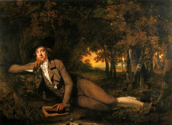 Editor: Here we have "Making Hay" by George Morland, executed in oil paint. It’s such a grounded image; you can almost feel the labor emanating from it. What do you make of it? Curator: Immediately, I see a depiction of rural labor, a subject often romanticized but rarely interrogated for its material realities. Consider the figure’s clothing—the worn fabrics, the practical hat. It speaks to the actual conditions of agricultural work and also his location in a very specific social strata. How do the materials used in the painting itself contribute to this representation, do you think? Editor: Well, the use of oil paint allows for rich textures, mirroring the density of the hay itself. The colors are earthy and subdued, further emphasizing the worker’s connection to the land. Curator: Exactly! And Morland’s brushstrokes… are they delicate, or are they capturing a more visceral sense of physical exertion? Think about how art academies historically separated ‘high art’ from depictions of common labor. Editor: I see your point. The slightly rough, almost hurried brushwork contrasts with the idealized landscapes often found in Romanticism. It brings a certain immediacy. It suggests the realities of work. The production of the painting becomes linked to the depiction of production. Curator: Precisely. And if we consider the art market at the time, who was buying these images of rural life? What desires were they fulfilling, and at what cost to those actually doing the work? Editor: That's really insightful. It shifts the focus from just appreciating the image to considering the whole system it was produced in. I’ve definitely got a different perspective now. Curator: Good, because, by examining the means of production of both the painting and the scene it portrays, we gain a much richer understanding of the work’s cultural significance.