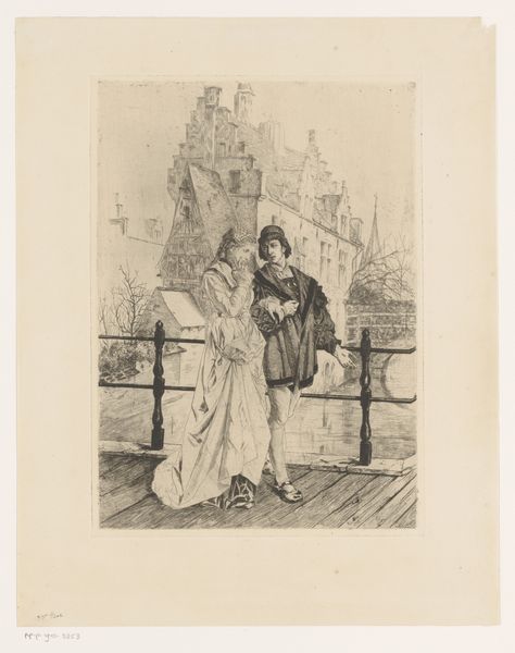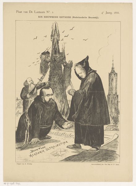 Curator: This intriguing engraving, titled "Spotprent over de grondwetswijziging in 1887", was created by Jan Holswilder in 1887. The medium—print on paper—affords us an opportunity to really delve into the intricacies of its design. Editor: The density of the hatching immediately strikes me, Curator. It gives the whole scene a claustrophobic, almost mournful quality. The high contrast heightens the drama considerably. Curator: Indeed. Let's look closer at the composition. The artist has staged the figures almost like a tableau, inviting a decoding. The "Tweede Kamer" or Second Chamber appears to be a tailor modifying the gown of "Artikel 194," while figures representing Dutch society look on. Editor: The tailoring gesture carries weight, suggesting a refashioning, an amendment of something fundamental. Note also the use of classical style to create drama that resonates in Dutch society as an ironic comment on governance. But why that particular mode of commentary? Curator: Precisely, as historians, we understand that political cartoons use visual cues and established imagery to comment on current events. Neoclassicism, popular at the time, may signal the weighty significance of constitutional change to its intended, probably middle-class, audience. And here it is used ironically to ridicule it. Editor: Now, let's focus on the figures observing this act. Their postures communicate a range of reactions: perhaps resignation or even outright disapproval, signaling a division of Dutch opinions on this grondwetswijziging or constitutional reform. It could reflect how the reforms impact people of differing wealth status and political opinions, not simply a set of detached formal elements. Curator: Agreed, and I believe the deliberate use of shadows casts another level to this political scene: from light to dark, the artist guides us on our journey for meaning. Editor: It’s thought-provoking how the stark formal contrasts reflect deeper socio-political fractures in 19th-century Netherlands. We’ve both deepened our insights into the relationship between style, politics, and material context. Curator: Indeed, making connections is always more rewarding than isolating observations; Holswilder clearly sought to capture more than meets the casual eye here.