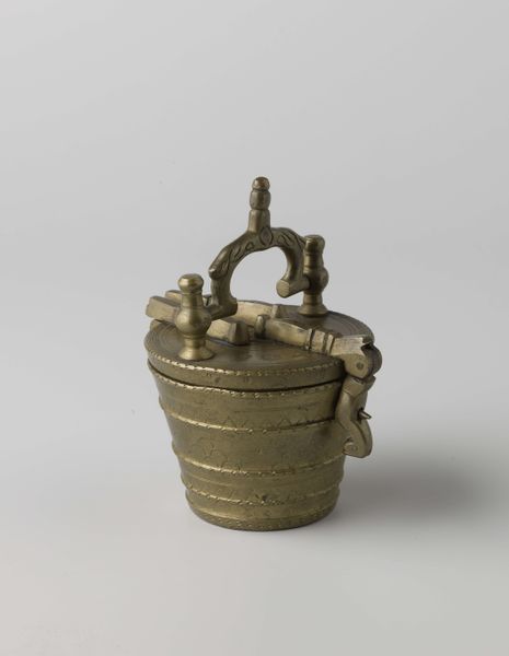 Editor: This is an intriguing object – a water bottle, or 'veldfles' as it's called, used by Lieutenant Colonel J.W. Kalkhoven around 1830. It seems to be constructed from various materials – perhaps leather, wood, and some kind of rope. The object has a well used patina; what do you make of it? Curator: What strikes me is the object's clear utility, a product of skilled craftsmanship yet decidedly not "high art" in the traditional sense. This ‘veldfles’ embodies the material conditions of military life in the early 19th century. Think about the availability – and constraints – of resources at that time. Where did Kalkhoven obtain the leather? How was it treated? What was the social context of its production? Editor: That's a perspective I hadn't considered. It makes you wonder about the specific labor involved, the hands that shaped this object. Was it a mass-produced item, or something more personal? Curator: Exactly! Consider the rope, likely hemp or flax. The way these common materials are shaped through simple manufacturing and assembled indicates both ingenuity and practicality, speaking volumes about the material culture of the military and beyond, but also begs a closer examination of class and social order during the height of imperial expansions. Editor: So, you’re saying we can understand more about 19th-century military life by looking at this everyday object? Curator: Precisely. This humble canteen speaks volumes about resourcefulness and a particular material context. By examining this object closely we can appreciate how military campaigns across Africa had vast social impact for people, manufacture and extraction of materials. Editor: That’s given me a whole new appreciation for what this ‘veldfles’ represents, its not merely functional, but embedded with social impact, now that I think of it. Curator: Indeed, challenging preconceived notions is important in appreciating the depth that an item such as this represents.
