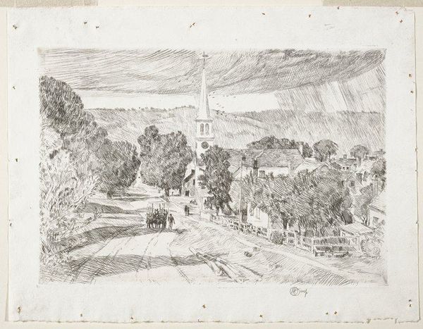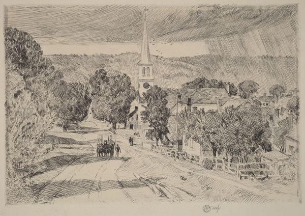 Curator: Before us is Childe Hassam's "A Vermont Village, Peacham." Editor: There's a distinct feeling of a gathering storm. The linear hatching really emphasizes the downpour, doesn’t it? Curator: Indeed. Hassam captures not just the physical space but also the atmosphere—notice how the church spire pierces through the tempestuous sky. Churches always mark sacred ground, but the tension between the village and the weather is unsettling. Editor: The composition itself directs your eye from the dark foreground, where the road and logs lie, right up to that light steeple. The contrast of values creates an incredible sense of depth. Curator: Hassam is subtly commenting on the resilience of community. The church, as a symbol of faith and unity, stands defiant against the oncoming darkness. There is a sense of hope here. Editor: A compelling print. Its structural dynamics and interplay of light and shadow offer more than just a pastoral scene. Curator: It speaks to the enduring strength of human spirit.