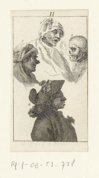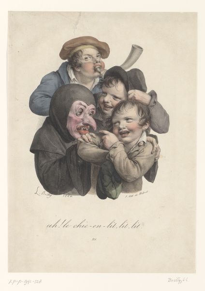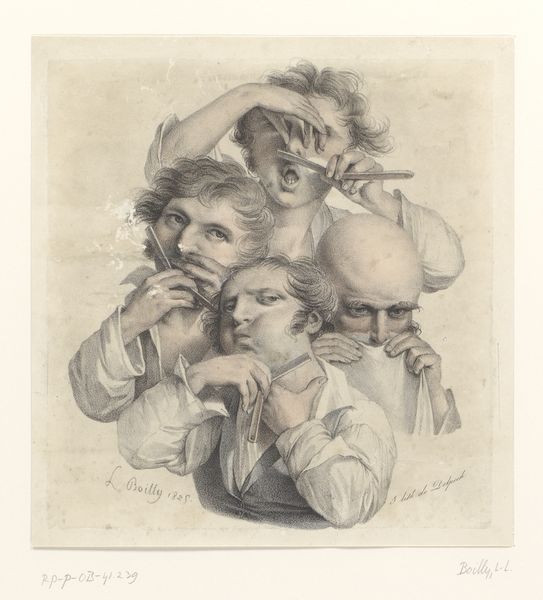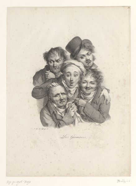 Curator: Isn't this drawing utterly delicious? All those faces... Editor: Yes, it's like a pressure cooker of expressions. They look deeply disturbed by something. Curator: Indeed. What we have here is "Caricature of four men and a woman with various facial expressions" created around 1823 by Louis Léopold Boilly. Boilly had a talent for capturing everyday life and here he gives us...well, life on steroids. Editor: The composition is interesting—almost a cluster of heads competing for space. I’m immediately drawn to the detail, though. It’s so finely rendered in pencil. The artist has expertly conveyed so much character in each face. Curator: Oh, the romance of a pencil. Simple medium for delivering cutting social commentary. Caricature really flourished in the 19th century, didn't it? A way to poke fun at the establishment and expose societal absurdities. I almost hear their cackles, or their pained groans. Editor: It is striking how unflattering these depictions are. There's almost a brutality to them, even though it’s just pencil on paper. I suppose it’s a means of deflating the egos of these figures. Showing people not as they think they are, but how others perceive them? Curator: Exactly! And what is more honest, if you want to think about it? The idea that we are multifaceted creatures and never completely knowable or understood. Think about how the art world, and society in general, has always enjoyed playing with identities and the construction of images. Editor: You can imagine this circulating amongst political circles, or maybe sold as inexpensive prints—a way for the masses to quietly critique power. Curator: Yes, absolutely. This pencil sketch holds a mirror up to society, warts and all. Art's role to entertain, provoke and instigate—so on point in those days and so powerful today. What's your takeaway after this glimpse at Boilly's work? Editor: I find myself thinking about the faces we present to the world, the performances we all engage in, and whether we can ever truly escape caricature. What about you? Curator: It’s a testament to the power of art as a voice. Boilly's drawings capture moments in time, offering us a lens through which we may consider human complexity with humor, irony, and critique. Thank you, Louis!