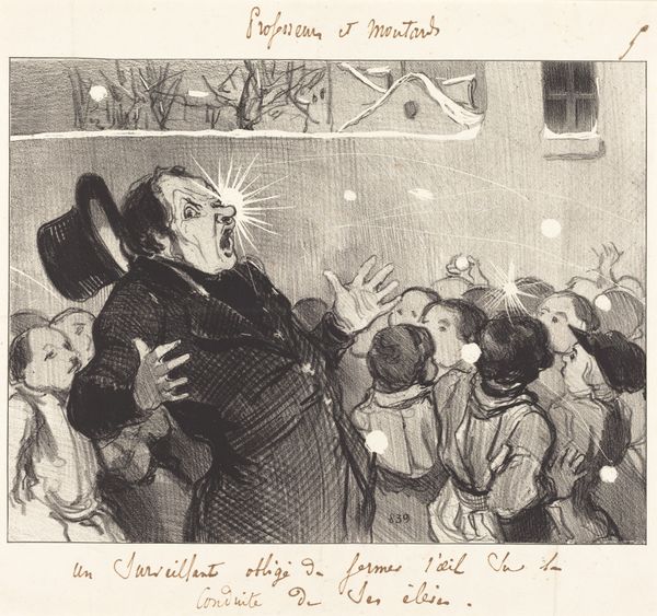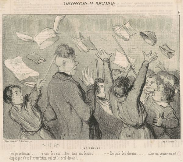 Honoré Daumier made this lithograph, "Comme quoi la gymnastique forme les membres...," using a technique that relies on stark contrasts to highlight the absurd. Look at how Daumier orchestrates the composition around the horizontal bar, using it as a fulcrum for physical comedy. The hapless student dangling by the rope on the left is balanced by another flailing precariously on the right, while the stern teacher is framed in between. The children below are depicted as a mass of uniformity, their individuality suppressed. Daumier's use of caricature destabilizes the established values of physical education, suggesting it may do more harm than good. The exaggerated features, especially the teacher's elongated nose, serve as visual signs that challenge fixed meanings. The formal qualities of this lithograph, with its strategic use of line and form, thus become part of a larger cultural critique, inviting ongoing interpretation of education and its discontents.