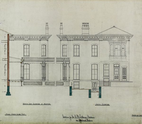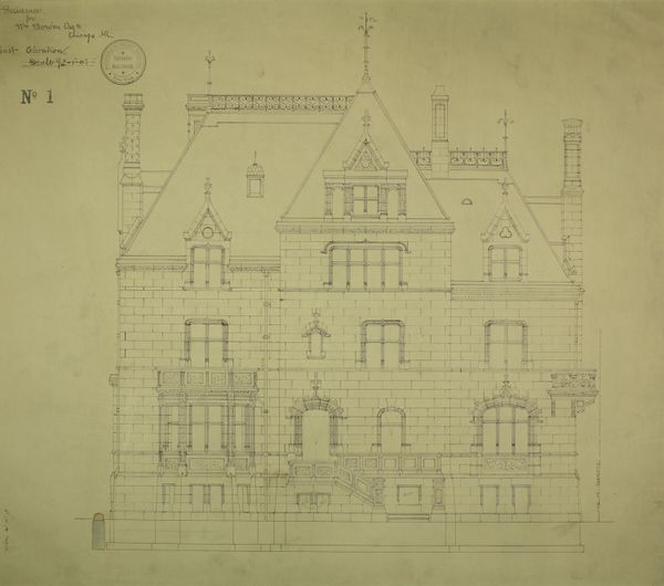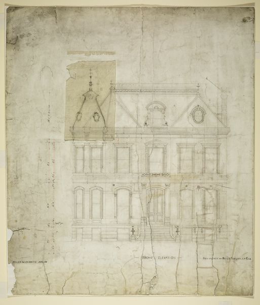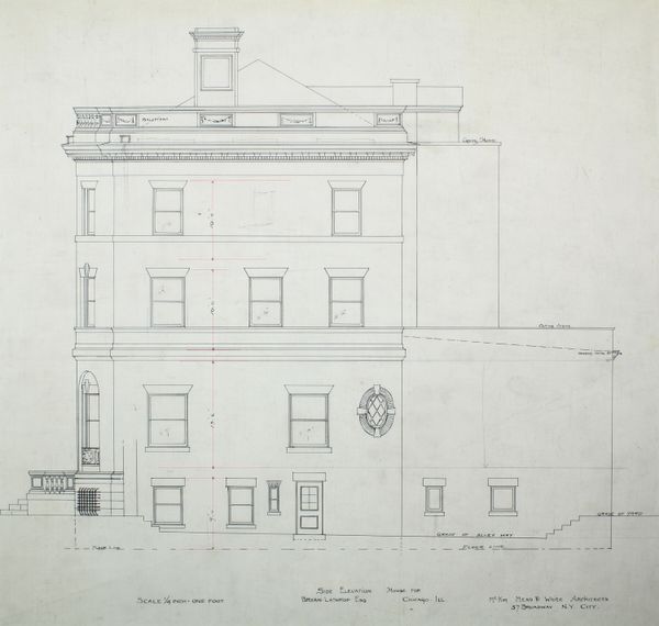 Curator: I am struck by the almost dreamlike precision of this architectural drawing. Editor: Yes, it certainly captures a bygone era. What we’re looking at is a side elevation for the James S. Norton House in Chicago, Illinois, rendered by Treat & Foltz in 1884. Currently it resides here at the Art Institute of Chicago. Curator: My initial impression is a house holding its breath. So static, poised, and upright! What do you make of the almost sterile presentation, especially within its socio-historical context? Editor: It's an interesting paradox, isn't it? On one hand, the elevation exudes a sense of aspirational gentility so characteristic of that period. This drawing provided builders all sorts of insights, though, too – notice the meticulous measurements marked. It served as a blueprint for a very tangible expression of wealth and social standing. The late 19th century was a transformative period where architecture served as a stage for rapidly shifting social structures, and that precision almost acts to codify and enforce the social hierarchy, doesn't it? Curator: Exactly! And to consider further, the Norton House represents a burgeoning urban elite. Architecture like this becomes an active participant in constructing identity, asserting dominance, and delineating social boundaries. Editor: And it’s rendered so starkly. I can imagine walking by and sensing how the lines themselves sought to etch some difference and deference onto its potential visitors. What do you think are the contemporary reverberations? Curator: These structures – and drawings like these – can illuminate both progress and persistent inequalities. They remind us of the need to critically examine built environments as active agents in the production and reproduction of power. In that sense, reflecting upon renderings like these becomes an ethical exercise as much as it is an aesthetic one. Editor: I see it so much clearer now. Thanks for untangling this for me! It's funny – seeing this drawing has made me reflect a lot about permanence. Maybe a building doesn't have to hold its breath. Maybe we can imbue it with life instead.
