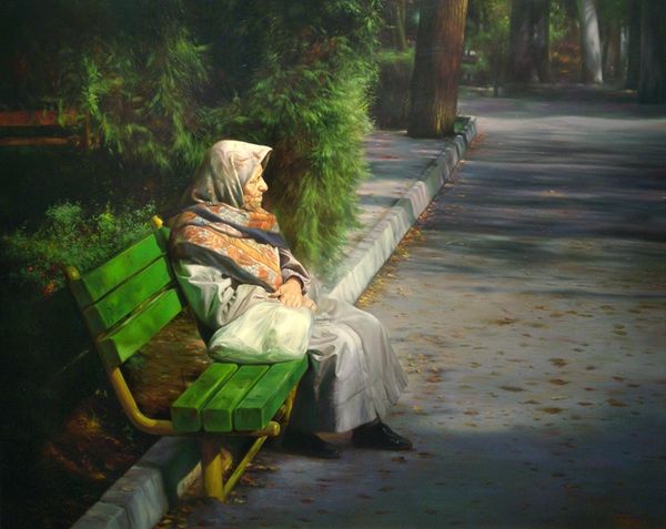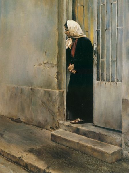 Editor: We're looking at "Anticipation," an oil painting by Reza Rahimi Lasko, created in 2013. The woman staring out the window evokes a sense of yearning. What kind of visual stories do you see embedded in this image? Curator: I'm immediately drawn to the symbolic weight of the window itself. Windows, throughout art history, represent thresholds – passages between inner and outer worlds, the known and the unknown. Her gaze directed outward suggests a deep longing. Notice the contrast in textures – the rough texture of the wall, the soft folds of the shawl, and the delicate lace of the curtain. Do you think that the artist employs texture to differentiate her internal and external worlds? Editor: That's interesting! I hadn't considered the textures. I suppose the soft shawl hints at vulnerability, whereas the window is her physical barrier with the outside world? Curator: Precisely. Consider, too, the headscarf. Depending on cultural context, it could represent modesty, mourning, or cultural identity. The dark color here can suggest sadness or introspection. And the ring on her finger speaks volumes. Is she waiting for a lover? A husband gone to war? What is kept hidden from her by that which she awaits? The cultural memory tied to such imagery can evoke profound emotion. Editor: Wow, I was just seeing a woman looking out a window, but there's so much more going on here than meets the eye. It is a powerful blend of emotion, symbolism, and masterful technique! Curator: Indeed. Visual symbols are so rich, constantly evolving and accumulating new layers of meaning through history and across cultures.