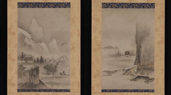 Editor: This watercolor and ink painting, possibly from somewhere between 1644 and 1911, is called "Landscape with Figure" and it’s by Xugu. I'm really drawn to how delicate and almost dreamlike the mountains appear. It's got this peaceful, solitary vibe. What do you see in it? Curator: It whispers stories of ancient wanderers and forgotten poems, doesn't it? To me, it’s as much about what isn't there as what is. Notice how the mist and cloud almost devour the solid forms. The mountains loom but their peaks fade into the heavens, like thoughts drifting away. The artist leaves much to the imagination. Are they trying to illustrate something external, or something internal, do you think? Editor: Internal, maybe? Like the figure in the boat is on some sort of quest? I hadn't really considered it that way, more of a nature scene. Curator: Exactly! And see how that small boat kind of melts into the scenery, becoming a part of something larger? I feel this painting isn't trying to simply portray a landscape; instead, it seems like it's reflecting upon humanity's place in nature, you know? A fleeting existence reflected in a wider expanse, where the world itself has far more to offer than the simple snapshot of life within a boat. What a statement! Editor: Wow, I didn't catch all that! It is much deeper than just pretty scenery. I’m starting to see how even the smallest detail, like the way the mountains fade, can add to the story. Curator: Precisely. And it shows how our perceptions change the more we ponder these kinds of concepts. Like peering into your own reflection, seeing more than just the surface! Editor: Absolutely, there's always so much more hidden beneath the surface if we only know how to see it. Thanks for sharing.