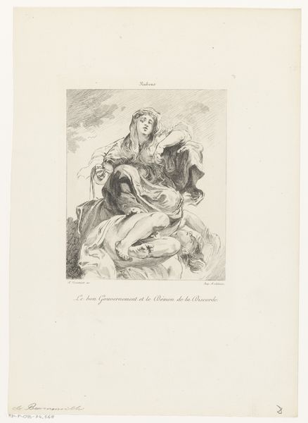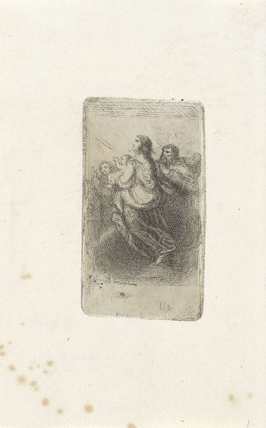 Curator: It looks like a dream on paper; light, delicate, maybe even fragile. Editor: That’s a fine initial impression for what we know as "Amazone", an engraving by Arnoud Schaepkens. The dating is a bit vague, somewhere between 1855 and 1904. Curator: “Amazone”, yet there’s this hazy quality that undermines a powerful title. The woman seems more a figure of reverie than action, which feels enhanced by the delicate linework. I wonder, what's being remembered here? What symbolic role does she carry? Editor: The material execution and the way prints are traditionally circulated—multiple impressions, often small-scale like this—suggest a wide distribution for potentially ideological purposes. Given the period, how does this reflect, or perhaps subvert, popular ideas of female empowerment tied to nationhood? Curator: Indeed! We see women as allegorical figures embodying nations, liberty, justice. The horse adds to that… a traditional emblem of power, harnessed and guided. It would be important to analyze which artistic tradition informs its symbolism—classicism, romanticism— to see how Schaepkens is positioning this figure in broader visual culture. Editor: Considering this as a print, it immediately connects us to a tradition of easily reproducible imagery aimed for wider audiences beyond elite circles. How the line quality affects its aura— its commodity value— against an original artwork, reveals certain social dynamics surrounding artistic production in this period. I am quite keen to examine further the impact and reach of the prints such as "Amazone." Curator: I am struck again by its ambiguousness and softness, despite what "Amazon" invokes historically. Thanks for your interesting views; I find it's more dreamlike than ever now. Editor: Thanks to you! Understanding its materiality encourages thinking beyond aesthetic concerns, touching upon its historical influence, cultural value and distribution.