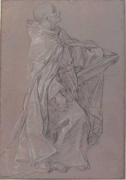 Editor: Here we have a drawing by Pierre-Jacques Volaire called "Shawled Woman Seen from the Back." It looks like it was made with charcoal and chalk on paper. It feels like a very private moment captured. How do you interpret this work? Curator: It’s compelling, isn't it? Immediately, I think of how often women’s identities have been framed and confined by the male gaze. Volaire gives us the opposite, really – a woman whose face we can't see, whose inner world remains inaccessible to us, a kind of quiet rebellion in its own right. How does this figure challenge our expectations of portraiture and representation? Editor: I guess I hadn't thought of it as a rejection, more just... observing. But that's interesting. Does the shawl itself carry any specific meaning, historically? Curator: Absolutely. Shawls were often markers of status, indicators of cultural identity. Think about the politics embedded in textiles, in clothing. Who had access to these materials, what did they signify within a particular social hierarchy? And considering this piece likely predates the French Revolution, it speaks to the visual language of class and maybe, even, dissent. Editor: Dissent? How so? Curator: The choice to obscure the subject's face, to focus instead on the draped form and the textures, almost democratizes the image. It pushes us to consider the human form and the weight of societal expectation more generally, instead of individualizing this woman through recognizable features. How can we extend the themes present here with contemporary feminist notions of representation? Editor: So it's less about her as an individual, and more about her as a symbol, maybe? I'll definitely be thinking about shawls differently from now on! Thanks. Curator: Indeed, a powerful illustration that makes you see representation with more critical eyes. It will be nice to research and read about it later, too.