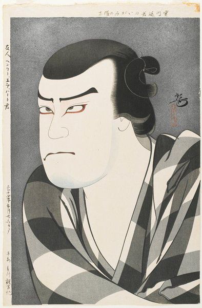 Editor: This woodblock print, "Confrontatie tussen twee sumo worstelaars," made in 1827 by Gigadō Ashiyuki and held at the Rijksmuseum, is… well, it's not exactly what I expected! For a wrestling match, the mood seems surprisingly serious, almost melancholic. He appears pensive. What story do you think this portrait tells, really? Curator: Melancholic sumo wrestlers! Now that's a haiku waiting to happen. Seriously though, what catches my eye is the contrast between the delicate lines of the print and the imposing physique of the subject. You see how the artist uses the striped patterns of the kimono to emphasize the figure's bulk, yet the face itself is so expressively individual? It hints at the humanity, the inner world, that even the most formidable athlete possesses. Or maybe he's just regretting that last bowl of rice? What do you think about the tension between strength and sensitivity here? Editor: That's interesting. I was focused on the sadness. I didn't really think about it as the sensitivity of the character. The stripes, yes I noticed the robe, but I just thought it was a neat pattern. Curator: The genius of Ukiyo-e, isn't it? Layering complexity into seeming simplicity. The artist is hinting at a specific actor, perhaps playing the role of a wrestler. I bet there are volumes concealed within. Almost like modern day sports photography capturing raw emotion, wouldn’t you agree? Editor: So, it’s a snapshot of a celebrity portraying a role and capturing a mood, not a record of wrestlers as such… I hadn't looked at it that way at all! The patterns create a frame that emphasizes the man’s character, and not simply as a record of wrestlers competing. Curator: Exactly! It invites you to wonder about the person behind the image, the fleeting moment captured, that’s very profound. Almost cinematic. Food for thought, yes?