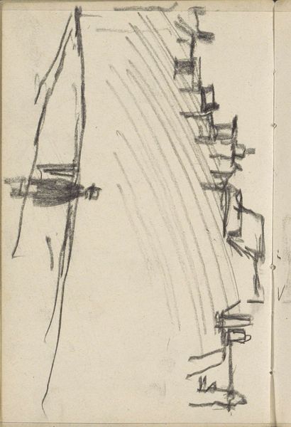 Johan Hendrik Weissenbruch sketched "Aangemeerde zeilschepen aan een waterkant" in graphite on paper, capturing moored sailboats by a waterfront. The composition is sparse, almost skeletal, emphasizing the verticality of masts and the stillness of the water. Weissenbruch's marks are not just representational, but also expressive in and of themselves. The sketch engages with structuralist thought, revealing how simple lines can create a complex visual narrative. The masts and sails, rendered with minimal strokes, suggest a semiotic system where each line functions as a signifier, pointing beyond itself to the idea of a sailboat, of maritime life. Consider how the negative space around the boats contributes to the overall form; it is not merely absence, but a positive element defining the shape and structure. This piece invites us to see beyond the surface and engage with the underlying architecture of seeing itself, where sketches reveal as much through what is omitted as what is included.