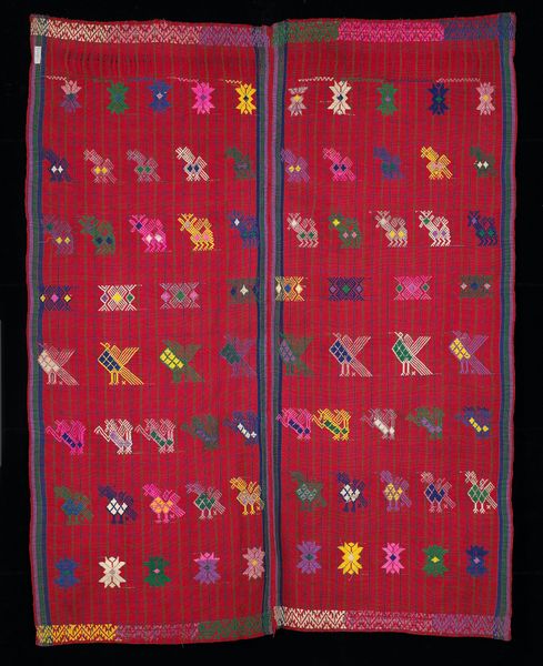Curator: We're looking at a piece titled "Young man's or warrior's wrap," which our records suggest dates back to around the 20th century. It’s a woven textile crafted from cotton. Editor: The composition is arresting; immediately my eye is drawn to the interplay of the robust reds and blues. It feels both grounded and vibrant. The geometric patterns evoke a sense of controlled energy, would you agree? Curator: Precisely. From my perspective, I find it fascinating to consider how this piece may have functioned within a specific cultural context. The materials chosen, cotton for instance, and the weaving technique employed would be indicative of available resources and the level of craft specialization within the community. The title itself hints at its social role. Editor: The balance between form and color certainly suggests significance. The grid-like structures formed by the blue squares offer a formal anchor, yet there's something almost subversive about the placement of those rhomboid figures that march across the right-hand panel. Are they referencing an armor detail or, more broadly, something symbolic? Curator: It's highly plausible. I see those as stylized renderings of spears or arrows. Each choice here communicates not just visual information, but stories and power dynamics of the period as well. Editor: Do you imagine it might reflect hierarchical structure in society through patterns? Curator: Indeed, such visual codings were common for designating status and lineage within traditional social systems, shaping the communities’ artistic economy. Editor: Thinking about this now I am also drawn to the visible evidence of its hand-crafted origin – small inconsistencies and individual decisions embedded in its geometry that no machine could ever duplicate. Curator: Absolutely. Its texture, those material choices, reflect something of the human effort expended to create this striking piece. It provides evidence of how aesthetic intent comes from community practices, revealing art's historical position within social activity. Editor: After reflecting, I'd say this work shows the potency found in even apparently straightforward arrangements, and what can emerge when structure embraces purposeful variations. Curator: Exactly. It has expanded my sense of artistic making and material cultures.