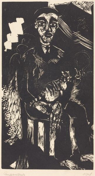 Curator: Ernst Ludwig Kirchner created this compelling portrait, "Ludwig Schames, Art Dealer." Editor: It has such a haunted quality, doesn't it? A sense of interiority, almost trapped, within the bold strokes. Curator: The sharp contrasts certainly amplify the emotional intensity. The woodcut medium itself lends a graphic directness, the planar surfaces creating a stark visual field. Editor: I see echoes of the traditional sage or wise elder in Schames's face – the deeply lined visage, the flowing beard. But there's a modern anxiety in the eyes. Curator: The composition's angularity and the distortion of perspective contribute to that anxiety, disrupting any idealized representation. It reflects Kirchner's Expressionist vocabulary. Editor: Perhaps Schames, as an art dealer, bore the weight of both tradition and modernity, a Janus figure caught between worlds, expressed poignantly through this portrait. Curator: Indeed, Kirchner pushes the boundaries of representation through form itself, to elicit such interpretations. Editor: A potent combination. It leaves one contemplating the burdens of cultural custodianship.