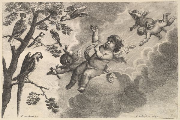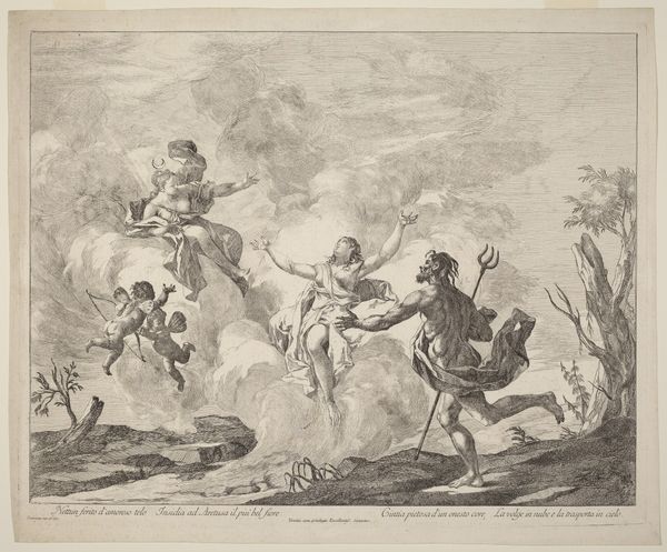 Curator: Allow me to introduce an engraving titled "Archangel Michael and Satan Contending for the Body of Moses." J.F. Clemens created this piece sometime between 1782 and 1831. Editor: My first impression is of dramatic tension; it feels like a theatrical tableau frozen in a moment of intense conflict. The monochromatic palette lends it a stark, almost timeless quality. Curator: Indeed. Clemens's neoclassicist style really shines here. It's not just a religious scene but also a commentary on power struggles, echoing contemporary political upheavals. Editor: The Archangel, of course, embodies divine authority. He appears almost weightless, radiating a sort of calm power. But look at Satan; he is writhing and contorted – visually representing his desperate claim to Moses. The body is such a telling site of the dispute. Curator: The selection of this particular biblical subject during the late 18th and early 19th centuries also carries weight. The enlightenment era witnessed intense debates over religious and political legitimacy. Prints such as this became powerful visual arguments on faith versus secular authority, widely accessible to the public through print culture. Editor: Notice also the dynamic postures; Archangel Michael’s piercing gaze seems to reprimand Satan while still exhibiting classical restraint, compared to Satan’s exaggerated response. Moses, prone between them, seems a battleground for this divine contention. Death made tangible through artistic rendering is unnerving, a lasting signifier of human conflict itself. Curator: I agree; this makes you consider the artist’s intentions and broader social impact of producing a visual argument in a commercial setting during periods of massive ideological change. It truly showcases art's role in popularizing important narratives and ideals. Editor: Ultimately, the power of Clemens’ engraving lies in its visual embodiment of a spiritual struggle, transforming timeless symbolism into a poignant and unforgettable narrative of eternal forces. Curator: The layered artistic meaning invites deeper explorations into our own engagement with narratives, be they religious or social.