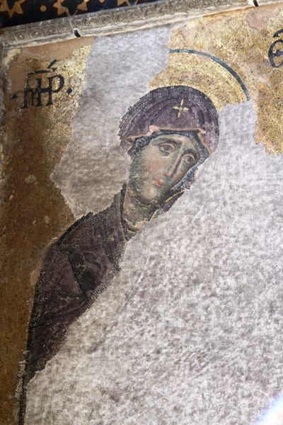 Curator: Here we have a section of Andrei Rublev's "The Last Judgement: Trumpeting Angel", a fresco from 1408, residing within the Assumption Cathedral in Vladimir, Russia. Editor: Well, the angel’s got this contemplative look – almost bashful – which seems an odd choice for the apocalypse! More like a musician who's forgotten his opening bars than the herald of, you know, EVERYTHING. Curator: Perhaps the moment right before the blare? Observe how the composition guides your gaze along the curve of the halo, down the slope of the angel’s face, inviting contemplation before the auditory announcement. The very Byzantine elements here emphasize an introspection rarely afforded in depictions of judgement. Editor: Right, it's like... okay, deep breath. "End times starting now. Are we ready? No? Too bad!" There’s such a stillness about it. The cracks in the fresco add this weird weight of history too – this moment has been coming, chipping away at the plaster, for centuries. Curator: Indeed. And consider the muted palette, rendered in earth tones. While the theme deals with ultimate fate and pronouncements, the application of color implies humanity itself as central, framing divinity through grounded forms and earthly substance. Editor: Almost comforting, isn't it? A stern but tender kind of visual pep-talk. Though the peeling surface makes me a little anxious… Maybe it needs a celestial restorer to swoop in and give it a facelift! Curator: Its weathered state grants a unique lens for observation and insight, one that time itself provides, marking cycles, transitions and the slow march toward whatever judgments ultimately await us. Editor: You're right; it whispers more than it shouts. It leaves me pondering on forgiveness, mercy, and whether my Netflix history will be brought up at the Pearly Gates. Curator: A reflection well fostered, prompting an emotional awareness which the artist imbued through carefully structured imagery. Editor: Yeah, Rublev made doomsday strangely, intimately human.