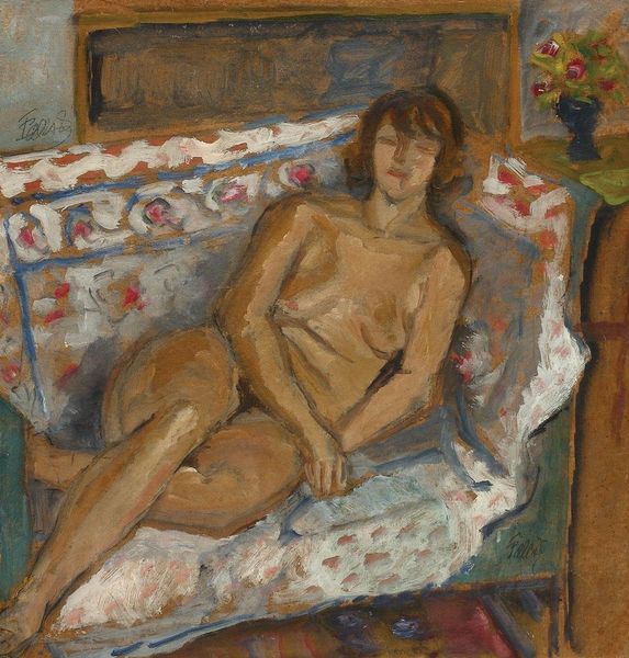 Curator: This painting, titled "Czóbel Béla Nude Women," showcases Bela Czobel's expressive style. The brushstrokes are quite bold, aren’t they? Editor: Absolutely. The earthy palette combined with the thick impasto lends the scene a certain weight, a feeling of the tactile and lived-in. One immediately gets the sense of how deliberately constructed each component is by how powerfully they interact with one another as artistic devices, like texture. It's hard to say for sure when this artwork was made, but how do the artist's style, application, and compositional elements relate to what he might have been observing or reacting to during its creation? Curator: Interesting you mention that, the model almost seems like she's become part of the interior space. Look how the orange and yellow tones blend from the figure to the couch and background. Do you think there's a symbology involved in those kinds of aesthetic connections that are presented by the creator? Editor: Possibly, if we consider Expressionism's fascination with inner states, the dissolving boundaries might reflect a psychological merging. Perhaps a feeling of isolation or alienation, in a similar way we see this depicted through Munch or Schiele's artwork of that time. The nude figure itself is, of course, a long standing symbol in art history... How would the artist and those around him during this particular era consider women, materiality, beauty standards and all of the labor required in creating the piece? What materials were more accessible than others and how could this effect the messaging? Curator: The lack of smooth blending, leaving visible strokes, shows a certain vulnerability and rawness. In relation to the symbol of the nude subject, and if we think about artistic labor and economic contexts, the visibility of the brushstrokes moves the object of the model from an objectified point to the object being raw artistic output that speaks of effort. Editor: Yes, these women appear very directly in the oil paint applied and the act of physically manipulating those oil paints gives agency to the painter in capturing an impression and turning that material itself into meaning. It gives a new weight to the term “objectification”, where we can study the object as matter in both a financial and creative light. Curator: Seeing how this raw material conveys vulnerability and meaning gives one a lot to contemplate. Editor: Indeed. Each stroke a testament to intention and interpretation.