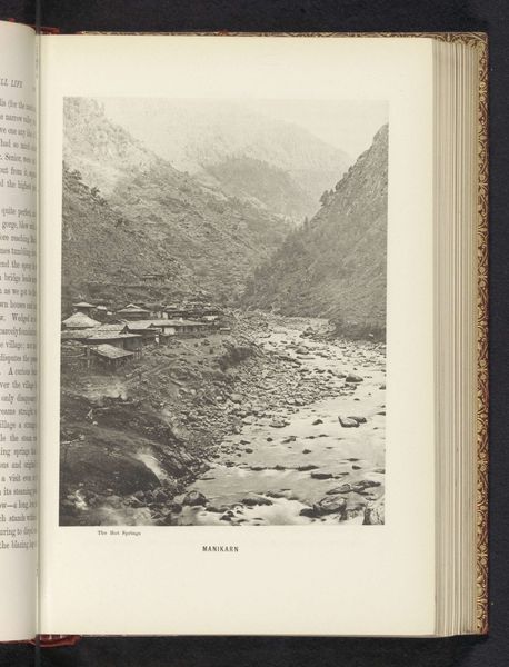 Curator: Welcome. We’re looking at “Sunset near Manikarn,” a gelatin-silver print dating to before 1895. Frederick Saint John Gore captured this scene with remarkable detail. Editor: There’s a strange serenity to it, even with all that rough rock. The monochrome tones create a unified composition and really draw you into the depth of the scene. The delicate greyscale emphasizes the geological forms, all the angled lines of stone—a symphony of sharp facets that is tempered by the hazy distance of the landscape. Curator: Note the placement of the human figures; diminutive, yet essential. The landscape's inherent sublimity diminishes the importance of humans, while conversely, it offers scale and focus for the setting. The tiny bridge linking these massive boulders has great symbolic import. Editor: How so? Tell me more. Curator: In this context, the image presents a visual metaphor for pilgrimage and transition. We see not only geographical transition, the obvious function of crossing the gorge. The perilous crossing reminds the viewer of the spiritual journey. Look also at the vast rocks that dwarf humanity: natural barriers or foundations of sacred places, or both. Editor: Yes, the more I observe the arrangement of elements in the print, I agree that it’s not merely representational. Gore's manipulation of perspective creates a sense of both nearness and infinite depth. It feels carefully, purposefully constructed, doesn't it? It also gives me a feeling of timelessness and peace, I find myself dreaming of ancient wisdom here. Curator: Indeed. Even the technical imperfections—the limited dynamic range of early photographic processes—contribute to the emotional content. They impart an antique, ethereal quality that suits the grandeur of the natural forms. Editor: I see a beautiful blend of representational document and symbolic tableau, offering layered contemplation about humanity's relation to nature. A fitting close to this overview. Curator: Quite so. Thank you for that compelling synthesis.