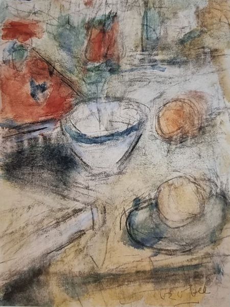 Editor: Here we have Bela Czobel's "Still Life," a pencil and watercolor drawing from 1969. There's something almost ghostly about it, a translucent layering that obscures as much as it reveals. What formal qualities stand out to you? Curator: The dominance of line, certainly. Note how the artist establishes form almost exclusively through contour. See how the varied pressure of the pencil creates a hierarchy, distinguishing between elements, the vase with greater emphasis than the ambient setting? Editor: I do. It's almost like the flowers are sketched into existence. And then the smudges of watercolor wash the image, unifying the parts. What is the effect of this limited tonal range? Curator: Exactly. The restricted palette creates a visual echo, linking object to the picture plane. Observe that even the perceived volume of the floral forms arises not from modeling, but from a build-up of layered lines, adhering strictly to the surface. What might this tension between depth and surface communicate to you? Editor: It makes me think about the act of seeing itself. We're not presented with a fully rendered scene, but rather the barest essentials required to understand what we're looking at. Thank you, I had not looked at it from that angle before! Curator: A valuable lesson, don't you agree, in extracting the essence of form, distilling it into its most fundamental elements?