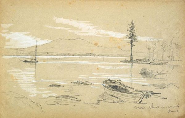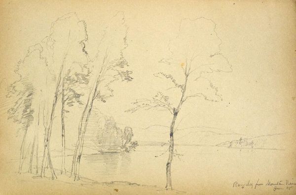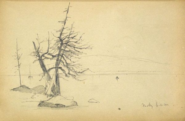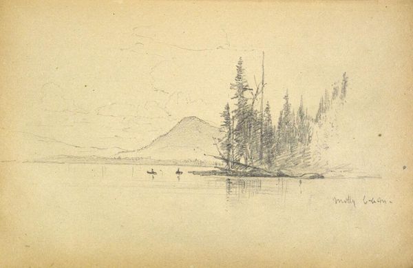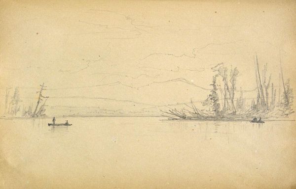 Curator: Benjamin Champney's "Richardson Lake, Maine" offers a delicate, almost dreamlike vista rendered in pencil. Editor: The somber tonality and rather bleak composition stir a sense of isolation. I wonder what it signified to Champney, considering the rapid industrialization of the era. Curator: Notice how the artist uses subtle tonal variations to create depth, particularly in the depiction of the mountains in the background and the reflective quality of the lake's surface. Editor: Yes, but I'm also struck by the dominance of the trees on the right, almost framing or even obscuring our view. Were these landscapes an escape from the social issues of his time? Curator: One could read that into it. However, the formal arrangement—the balance of light and shadow—is undeniably captivating. Editor: Indeed. Even through this lens, the sketch becomes a testament to the complex relationship between art, nature, and the artist's socio-political position.