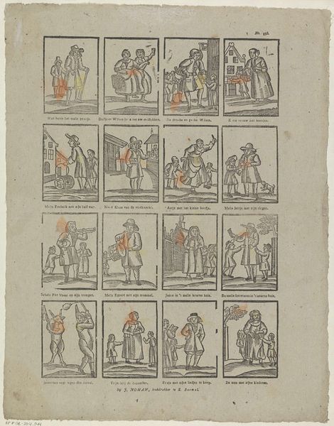 Curator: Looking at Johan Noman's "Verschillende ambachten, en bedrijven," which translates to "Different crafts, and businesses," created sometime between 1806 and 1830, one is immediately struck by its systematic cataloging of daily labor. Editor: Oh, it feels like flipping through a faded storybook! A somewhat absurd one, with these tiny, earnest figures going about their business in what seems like a miniature Dutch town. Almost a proto-comic strip. Curator: Exactly! This print offers glimpses into the socio-economic fabric of early 19th-century Dutch society. Each panel presents a different trade or profession, highlighting the diversity of labor. It prompts us to think about class, and the value ascribed to manual work. How those values might echo to the present day, too. Editor: You know, each vignette is a tiny world of its own. The engraver, for instance; so self-absorbed, bent over their desk—seems oddly like my desk at times! It gives the artwork a sort of intimacy and a gently satirical air at once. I can relate to them, laboring away to produce. Curator: That connection to lived experience is key. We must also acknowledge that depictions like these were not always neutral records. Consider how power dynamics are reflected or omitted. Who is represented, how, and why? Editor: Hmm. Something in the stark simplicity is striking. You are also wondering about the anonymous labor of these images: both in what is shown and who it shows. They become these poignant little poems about daily life in a time before mass production. Curator: Precisely, it provokes so many questions. Editor: Right. This little Dutch panorama of human industry also is a memento mori and compels to me think, too, about all these crafts disappearing today. Thank you for making the context come alive.