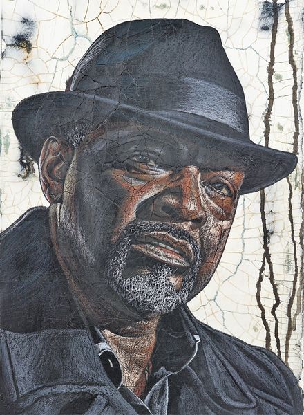 Editor: We’re looking at “Troy” by Alfred Conteh, a compelling drawing. The textures Conteh achieves with pencil are incredible; I’m struck by the subject’s serene but solemn expression. How do you interpret the artist’s choices in terms of form and composition? Curator: Let us begin with the figure itself. Note the stark contrast between the deeply shadowed face and the softer background wash. This chiaroscuro effect not only sculpts the face but also isolates the figure within the picture plane. Observe the minute details of the hair; each curl meticulously rendered. It directs the viewer's attention to the very formal, careful technique. How does this tight rendering compare to the washes surrounding it? Editor: It does create a pronounced tension, the textures play against each other; almost vibrating and making it so visceral. Curator: Precisely. Consider the background's role in amplifying the emotional qualities that you have noticed in this figure. Its colors gradient from darker to lighter hues, echoing the modeling on the face but also receding to create pictorial depth. It supports and directs our reading. How do these formal devices amplify one another, creating unity from a series of apparent oppositions? Editor: By repeating some elements—like you pointed out in the figure's modeling and background gradient—but keeping the foreground crisply detailed against the atmospheric background… I'm beginning to see how the work is emotionally balanced by being so visually unbalanced! Curator: Exactly. And how that carefully staged visual balancing act draws the viewer in. Every choice emphasizes not only technical mastery, but ultimately a complex arrangement. Editor: That tension between skill and… meaningfulness, right? Well, thank you! I have a much better handle on Conteh's formal strategies now!