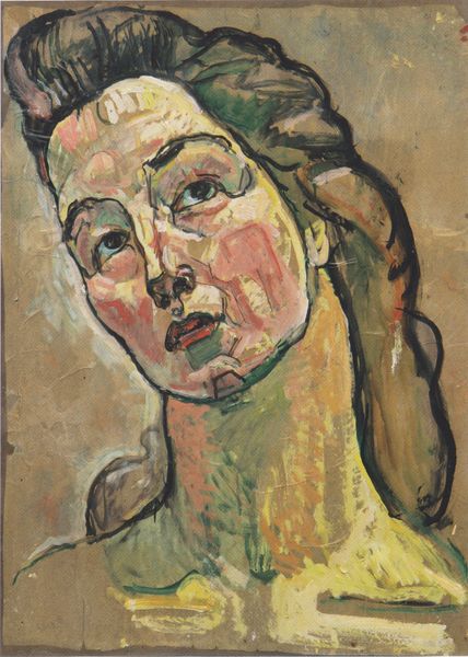 Curator: Anatoli Papian created "Portrait of Anna" using oil paint in 1983. Editor: My first impression is one of quiet intensity. The somber palette creates a contemplative mood. Curator: Observe the impasto technique. The visible brushstrokes and layering of paint construct the planes of her face, animating it with a tactile dimension. This construction contributes to a softened, abstracted, yet direct composition. Editor: Precisely. Given that this work dates to 1983, it's essential to consider its cultural context. It's worth asking if the painting alludes to the sociopolitical dynamics shaping the lived experiences of women at the time? Or if there’s something about her pose, slightly closed off, with averted eyes, that signifies something. Curator: Certainly, interpretations tied to social or political identities have merit, but notice how the painting exists in a more universal symbolic register through its formal construction: how the gaze operates, how planes of her face align, and what that overall structural dynamic suggests to the viewer. Editor: I agree. The woman's steady gaze meets ours directly, demanding recognition. Moreover, the work engages themes surrounding cultural representation in portraiture – who is seen, and how. In thinking about her averted eyes in context, it becomes an inquiry into identity and personhood in this period. The historical lens allows for a critical investigation of this portrait's role in perpetuating or challenging systems of visibility. Curator: This piece really encourages considering both its aesthetic values and possible implications, revealing that even an intimate portrait engages wider symbolic meaning. Editor: Right, examining art like this shows the interwovenness between an artist's vision and sociopolitical forces. These connections enrich our appreciation for artistic practice and legacy.