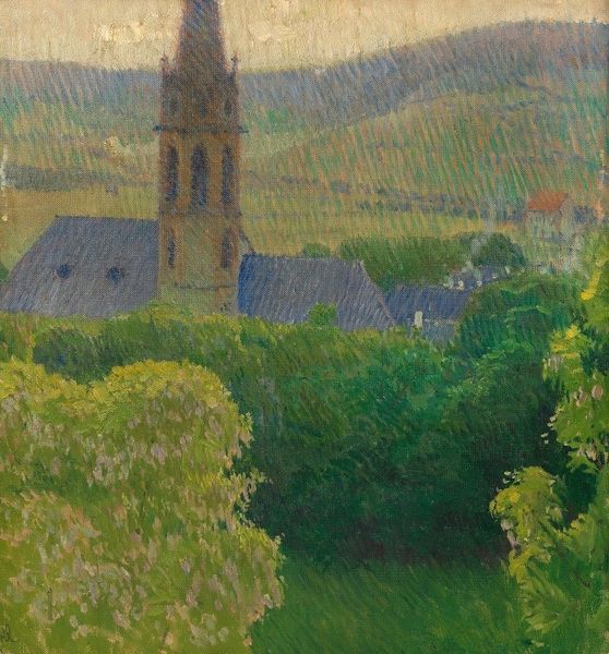 Henri Martin painted L’église De Labastide Du Vert using an oil-on-canvas technique known as pointillism. A laborious method, pointillism involves applying countless tiny dots of pure color, which then blend optically when viewed from a distance. This was not just a visual strategy, but a material statement. It was meant to parallel the division of labor in industrial society, breaking down the act of painting into discrete, almost mechanical gestures. Martin's application of pointillism gives the scene a vibrant, shimmering quality. Each small dab of paint contributes to the overall texture and luminosity of the painting. The technique invites contemplation on the time and effort invested in its creation, transforming the landscape into a mosaic of social meaning. Through his meticulous process, Martin elevates the status of craft within fine art. The painting reminds us that the value and beauty of art lie not just in the image, but in the materials, the making, and the context.