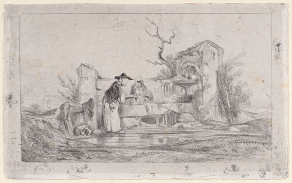 Curator: This delightful pencil drawing is "Two Monks Gazing over the Bay of Naples" by Heinrich Karl Anton Mücke, created around 1840. Editor: Immediately, I am struck by its quiet contemplation, that hazy distance. The contrast is captivating, you have very detailed figures in the foreground which fall away towards very simple and ephemeral atmospheric conditions. Curator: Exactly! Consider Mücke's process; how did his materials influence the end product? Pencil lends itself so wonderfully to both detailed line work and soft gradations. It speaks to Romanticism's broader appeal and the accessibility it held to common folk through reproducible processes and affordable artworks. How was this artwork consumed, I wonder, and what was it up against? Editor: A compelling consideration! Visually speaking, notice how the stark horizontals of the wall and the sea interact with the soft, flowing forms of the monks' robes. The artist is clearly focused on creating a visually harmonious relationship of shapes and forms, even playing the vertical lines in the fabric to echo with the rocks in the middle-ground, lending that touch of solemnity to the entire composition. Curator: And it's through their vantage point that we truly witness Naples' allure; this composition reveals what this landscape means to people like those two cloaked individuals. It gives them an encounter of transcendence, framed by labour and trade across time and distance. This perspective speaks of the socioeconomic dimensions entwined within what looks merely scenic. Editor: From a purely compositional stance, the subdued palette reinforces that contemplative air, doesn’t it? Look at the expert use of tonal variation to create depth, and those minute cross-hatchings in the shadow details--exquisite and economical! The almost spiritual atmosphere that all these elements culminate in is not to be neglected! Curator: Precisely; even that seemingly subdued palette plays into class and industry because art materials in the mid-19th century still faced barriers of entry for marginalized groups; so many had something urgent or hopeful to say! We must acknowledge art not just through its visuals alone, but through who had a right to participate and express what it looks to "overlook Naples," in this case. Editor: Fascinating to ponder those wider implications of art production and access. From my view, engaging with this artwork’s structural essence highlights the core elements that foster its aesthetic impact and symbolic resonance. Curator: Right, while it appears quite placid on the surface, by considering context it spurs thoughts of past and continued socioeconomic structures that shaped art such as this for both creators and viewers then...and now.