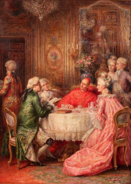 Curator: Let's discuss Angelo Zoffoli's work, generally known as "The Waltz." The painting uses oil on canvas. Editor: A riot of rococo! Just looking at this, one can almost feel the powdered wigs and the swirling silk. The composition itself feels like a dance, doesn't it? Curator: Indeed. Zoffoli masterfully arranges the figures within a clearly defined pictorial space. Notice how the implied lines of sight and gesture converge toward the dancing couple, thereby generating visual momentum. Editor: And all contained within this very specific historical framework. Look at the opulence of the room! It shouts aristocratic privilege right before the revolutionary tumbrels started rolling. It serves as a potent visualization of social dynamics on the precipice of transformation. Curator: Semiotically, we can dissect the visual rhetoric of status on display here. Consider the costumes—the lavish gowns, the controlled posture and restrained movements of the individuals. Everything contributes to the overarching narrative of elevated rank and power. Editor: Yet, there’s also an inherent artificiality to the scene, wouldn't you agree? A performance, as if everyone is acting for an audience, entrapped by restrictive codes of social conduct. Almost sad beneath all of that glittering display. Curator: This tension, the interplay between genuine expression and enforced decorum, lies at the heart of the image’s success. Note the chromatic distribution; the bright dresses contrast with the rather stern green walls and furniture—a deliberate choice enhancing dramatic effect through contrasting tonal values. Editor: You know, seeing it again makes me think about art's function in shaping memory and legacy. It not only preserved, but also subtly commented on a certain political regime on its way to total reformation. A time capsule and political declaration wrapped into one painting. Curator: Precisely. And a brilliant lesson on what sustained compositional rigor, combined with chromatic acuity, can achieve in terms of delivering art with social bite and philosophical substance. Editor: Yes, well said. I look at the painting with a better sense of it now and understand a lot more than I did.