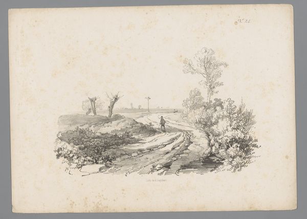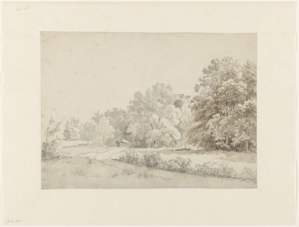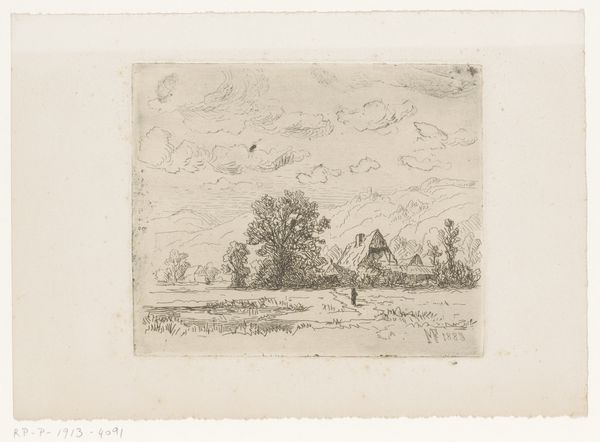 Editor: Here we have "Landschap met figuren en boerderij", a landscape etching by Jean Augustin Daiwaille, dating from sometime between 1796 and 1850. It's on paper and evokes such a serene feeling, almost like a faded memory. What captures your eye when you look at it? Curator: Ah, faded memories indeed! It reminds me of those sepia-toned photographs in antique shops, whispering tales of simpler times. The soft, almost ethereal quality of the etching, achieved through delicate lines and subtle shading, pulls you right in. It makes you wonder about the lives of those tiny figures and what their daily routines were. But tell me, does the composition remind you of anything? It feels almost…stage-like, doesn’t it? Editor: I see what you mean, there's almost a theatrical feel, with the trees acting as wings. Curator: Exactly! Daiwaille is almost choreographing the scene. It's more than just a landscape; it’s a narrative, prompting us to write our own stories within it. How do you feel about that subdued sky, by the way? Doesn't it set the whole melancholic mood? Editor: Absolutely, that hazy sky definitely contributes to the overall feeling of nostalgia and peace. Curator: Isn’t it remarkable how much emotion can be evoked with so few lines? It’s as if Daiwaille captured a fleeting moment, a whisper of existence. You almost want to step into the landscape and experience the quiet beauty for yourself. It truly transports us! What did you learn in looking at this image? Editor: I am really thinking more deeply about how to look beyond the literal, into the underlying emotion of an image. Curator: Wonderful. Art really offers those amazing and transcendent moments of clarity and revelation if we truly seek them!