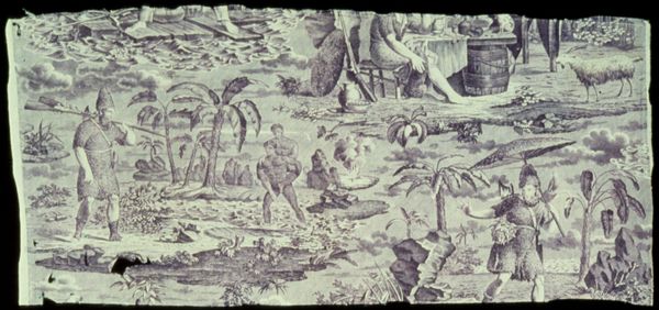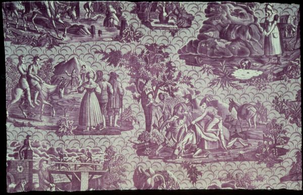 This panel was made by an anonymous artist, and we can appreciate the materials and processes used in its creation. The panel showcases a picturesque scene, possibly from the 18th century, printed onto a textile. The monochromatic print, reminiscent of toile fabric, captures various vignettes of daily life. The material, likely cotton or linen, lends a tactile quality to the artwork, inviting closer inspection of its detailed scenes. The artist probably used a labor-intensive process, potentially involving engraved copper plates or woodblocks, to transfer the design onto the fabric. The choice of textile as a medium infuses the artwork with social and cultural significance. Textiles were historically associated with domesticity and craft, challenging traditional distinctions between fine art and utilitarian objects. By employing this medium, the artist elevates the status of everyday materials, imbuing them with artistic value. The detailed scenes depicted on the panel reflect the social context of its creation. The panel invites us to reconsider the boundaries of art and craft.