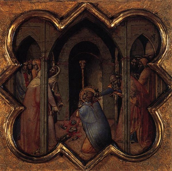 Curator: Giotto’s fresco, "Christ Among the Doctors," painted around 1306, is found within the Scrovegni Chapel in Padua. My initial reaction is a sense of contained tension, a feeling amplified by the fresco medium itself which inherently suggests permanence, almost trapping the figures in the moment. Editor: Trapping, that’s an interesting way to put it. To me, it's all about how the physical construction mirrors the subject matter. A fresco, built layer upon layer on a prepared wall – it's an incremental process, not unlike the accretion of knowledge that Christ demonstrates here among the scholars. Curator: That's a thoughtful observation. It certainly emphasizes the symbolic weight of each character. Christ, centered and haloed, uses gestures—the hand raised, the slight turn of his body—which, combined with the tilted heads and intense gazes of the doctors surrounding him, communicates an energy that really defines this scene. And what do you make of the material execution of that architectural space behind them? Editor: The architecture serves to enhance that feeling of compressed intellect. Consider the use of color; earthly tones dominating, creating a tangible and somewhat somber atmosphere that really brings to the fore Christ’s youthful vitality in vibrant contrast to their learned age. It feels very constructed in its presentation and use of material to create meaning. Curator: Yes, and I find myself circling back to the symbolic weight within those interactions. The halo becomes not just an attribute, but a signal. Those around Jesus regard him as one holding important significance in this space. The material reality reinforces the emotional one. Editor: Indeed. Giotto is masterful here. By highlighting materiality in the fresco medium – how its built-up presence informs the context -- alongside its symbolic imagery, one gets a profound understanding not just of craft of early Renaissance art, but of humanity in seeking. Curator: Well said! The layered application of the fresco underscores Giotto’s insight: seeking knowledge, faith, even artistic understanding, is a layered process. Editor: Precisely. This piece reminds me that even materials possess profound and durable visual and contextual relevance.