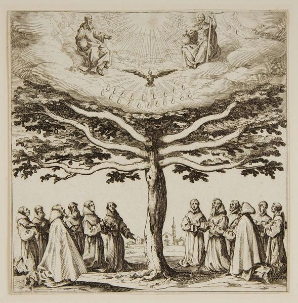 Curator: Jacques Callot's "Tree of Saint Francis," housed at the Harvard Art Museums, presents an intriguing allegorical scene. What's your first impression? Editor: It feels remarkably balanced, despite its otherworldly subject matter. The ethereal figures above contrast nicely with the grounded monks below. Curator: The print uses the tree as a metaphor for the Franciscan order. The figures in the clouds represent God and other divine entities bestowing blessings upon the order, symbolized by the descending teardrop shapes. Editor: It's interesting how the image positions the monks within this framework of divine legitimacy. What role did prints like this play in shaping perceptions of religious authority? Curator: Exactly! These prints served to reinforce the power dynamics of the church and its various orders, solidifying their social standing and spiritual influence among the populace. Editor: Considering how the church was dealing with criticisms at the time, images like this served as a reminder of faith and tradition. Curator: A powerful visual statement indeed. Editor: I appreciate the way this piece encapsulates a specific moment in religious and social history.