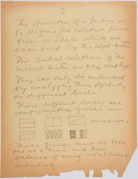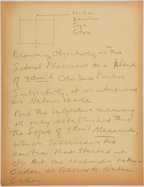 Curator: Looking at Stuart Davis’s “Art Theory Text with Directional Color-Space Diagram”, I’m struck by its raw, almost sketch-like quality. It feels like a page torn from a notebook. Editor: Absolutely. It reminds me that artistic expression is deeply rooted in theory and social contexts. The artist's words point to the underlying structures that determine our experience of the world, not just visually but conceptually. Curator: Exactly. The simple diagram combined with the complexity of the text encapsulates his exploration of unity, size, shape, and space, hinting at the socio-political dimensions of visual language. Editor: Well said. The Harvard Art Museums really gives us access to Davis’s process of connecting art and thought, and the social impact of visual communication in society.