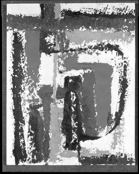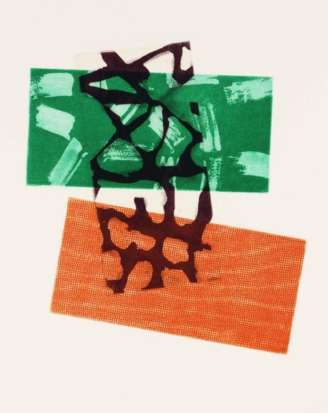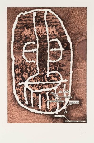 Curator: This print, without a specific title, is part of Esq Tom Phillips’s “Canto VIII” series and is held in the Tate Collections. The piece presents a rather curious arrangement of horseshoes, a hand, and an ambiguous figure. Editor: My first impression is one of fragmented folklore—a surreal blend of lucky charms and unsettling imagery. The textures create a visual cacophony. Curator: Indeed. Phillips often layers meaning through found text and imagery, challenging our understanding of authorship and artistic process. The use of screen printing allows for a mass-produced feel, juxtaposed with unique artistic interventions. Editor: I'm drawn to the stark contrast between the grey ground and the rust tones. It accentuates the flat picture plane, emphasizing the symbolic weight of each element. Curator: Looking at the role of chance and deliberate design, one sees a meditation on the human condition—perhaps on luck, labor, and the stories we tell ourselves. Editor: A fitting conclusion. It leaves one pondering the narrative threads Phillips weaves so subtly.