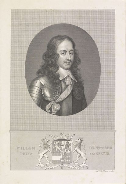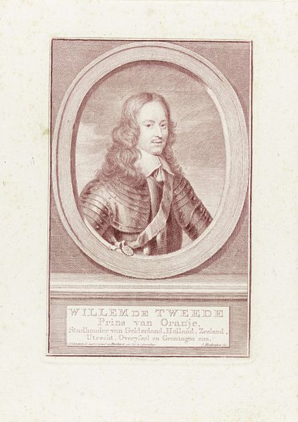 This engraving of Willem II, Prince of Orange, was made by Jacob Houbraken in the Netherlands at an unknown date. The prince is depicted in armour, framed by an oval border, with a plaque below bearing his name and titles. The image speaks to the visual codes of power and status in 17th-century Dutch society. As Stadtholder, Willem II represented a powerful political force in the Dutch Republic. The House of Orange was a focus for those who favoured a more centralized, military government, in opposition to the mercantile elites of the towns. The print served as a tool for shaping Willem's image, reinforcing his authority through visual association with military strength. This occurred during a volatile period in Dutch history, as Willem attempted to increase his power, leading to a coup attempt shortly before his untimely death. Understanding the social context of this print involves delving into the political history of the Dutch Republic. Research into the House of Orange and the political factions of the time can shed light on the print's intended audience and its role in the ongoing power struggles of the period.