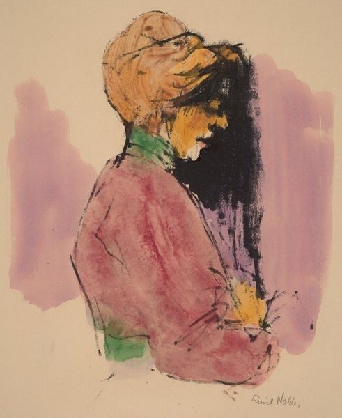 Curator: Here we have "The Peddler," a 1913 color lithograph by Emil Nolde, currently residing at the Minneapolis Institute of Art. It’s a striking piece, wouldn't you say? Editor: Striking is one word for it! It hits you, doesn't it? A slightly sinister figure rendered with raw immediacy. It's intriguing and vaguely unsettling; the world-weariness practically leaps off the paper. Curator: That immediacy is characteristic of Expressionism, and Nolde was a key figure in that movement. Note how the lines are deliberately rough, almost violently applied. He eschews traditional artistic refinement to convey deeper emotional truths. In this work, Nolde employs caricature to symbolize the burdens the common laborer carried. Editor: Symbolism! That's what draws me. The heavy pack practically dwarfs him – a potent representation of labor's toll. Those exaggerated features... almost grotesque. Are we meant to feel pity? Or something more complicated? I mean, look at that striped shirt; a burst of unexpected color amidst the otherwise somber tones. It’s almost mocking in its cheerfulness, creating such emotional tension. Curator: Nolde uses color masterfully for precisely that purpose. He understood how visual elements, when combined, evoke layered feelings and trigger different modes of perception, rooted in social constructs, histories, and lived experiences. The red and white of the peddler’s shirt could symbolize struggle, labor, and an everyman’s yearning. And notice how the figure's downward slant suggests physical and even existential weariness, not only highlighting social inequity, but evoking an emotion familiar to all humans. Editor: Absolutely. The whole piece really feels…visceral. It avoids easy interpretations; the ambiguity forces engagement. It asks us to question what we think we know about labor, class, and the human spirit. It feels more vital than mere commentary. Curator: Exactly! Nolde’s art isn’t just observational. It’s designed to confront us with uncomfortable truths, both about the world around us, and the truths held by those burdened and heavy laden among us. "The Peddler" encourages us to examine our relationship with value systems. Editor: Well, Nolde definitely succeeded in stirring something profound, didn't he? Even a century later. It is always amazing to observe art continuing to perform new work and yield unexpected meanings.
