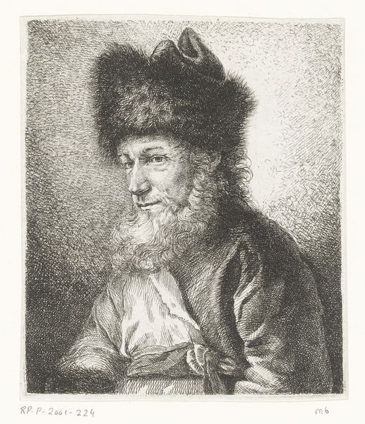 Editor: This is "Buste van een oude boer met een puntmuts," or "Bust of an Old Farmer with a Pointed Cap," an etching by Adriaen van Ostade, dating from between 1648 and 1941. There's a quiet intensity to the old man's gaze, even though it's such a simple portrait. What strikes you about this piece? Curator: What grabs me immediately is how van Ostade's piece encapsulates a shift in Dutch Golden Age art towards depicting everyday people, granting visibility to those often marginalized. This wasn't just about representation; it was a quiet form of social commentary. Have you considered how this portrayal challenges the established norms of portraiture at the time? Editor: That's interesting! I hadn't really thought about it in terms of social commentary, more as just a straightforward depiction of a commoner. How does his choice of subject matter intersect with broader cultural movements of the time? Curator: Well, consider the rise of the bourgeoisie and their patronage of the arts. Artists like van Ostade started reflecting their world back at them, moving away from purely religious or aristocratic subjects. It acknowledges the working class's presence. What do you make of the farmer’s weathered features, etched so meticulously? Editor: I guess I saw them as just…details. Part of the realism, I suppose? Curator: But don't they also hint at the hardships, the lived experiences of this particular individual? Think about how etching, as a medium, lends itself to capturing those fine lines, those marks of labor and time. It gives him a presence that, as a genre painting, could have been dismissed. It moves away from romanticism and acknowledges that reality and hardship exists. Editor: So, it's not *just* a portrait; it's a statement? I’m beginning to see a deeper purpose beyond just depicting someone's likeness. Curator: Precisely. Art is rarely ever 'just' anything. It's a conversation with the past, present, and potential futures. What do you take away from that? Editor: I think I understand how art can quietly question power and gives a voice to those often unheard. It definitely made me rethink simple portraits like this. Curator: Wonderful! Keep questioning, keep digging. That’s where the real discoveries lie.