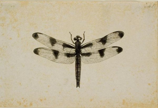 Curator: At first glance, it presents almost a specimen, doesn't it? Precise, a little cold. Editor: Perhaps, but it's exquisitely rendered! I can practically feel the transparency of those wings. There’s real skill involved here, and it immediately invites us to contemplate the methods employed to arrive at this naturalistic representation. Curator: Indeed. What we're viewing is Joris Hoefnagel's "Plate 53: Southern Hawker Dragonfly", made around 1575-1580. Hoefnagel worked primarily with watercolour and colored pencil, evident in the delicate layers used to create this illusion. This particular plate is incredibly intriguing as it seems to borrow from the symbolic weight we give to insects—their ability to signify transformation or vulnerability. Editor: Thinking about material process here—the thin washes of watercolor, painstakingly applied. What was the availability of these colored pigments in the late 16th century? Who had access? We are clearly observing fine craftsmanship. The use of this medium to meticulously reproduce every tiny vein on each wing suggests something about the commissioning of the work too, or its place in the economy. Curator: You raise interesting questions. Dragonflies, since ancient times, appear across cultures as symbols of illusion, change, and the ephemeral nature of life itself. Its inclusion could speak to mortality or metamorphosis depending on where it's presented. Editor: Yet it strikes me also that insects as material agents weren’t always neatly symbolic either; beyond that, I wonder about how the consumption and disposal of material products changed people’s relationships to objects or species that could be classified alongside other consumables. I see Hoefnagel participating in a burgeoning moment in history of visual observation. Curator: A powerful insight! And a point well-made, reflecting that perhaps art-making isn’t exclusively a mental project; what is so fascinating to consider are not only the psychological but material conditions that impact the visual legacies that objects create, which stay around far longer than artists who laboriously assembled them ever will. Editor: Quite. We could probably both go back and forth between image and object, between cultural code and production site, to analyze any other aspects here.