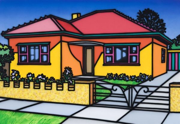 Curator: Oh, that gives me a jolt! It's so…stark, in a way, but also cheerful. It’s like a cartoon decided to become a three-dimensional object. What are we looking at? Editor: This mixed-media sculpture is called "House I," by Roy Lichtenstein, created circa 1996 to 1998. It is a fascinating example of his engagement with domestic imagery and pop-art conventions. Lichtenstein explored everyday American life in a stylized and bold way throughout his career, but I am particularly interested in its playful quality, turning a commonplace subject into something extraordinary, something iconic. Curator: Iconic, yes, definitely. It hits that primal feeling of "home," that safe space, but warped. Look at those solid colors and the heavy black outlines! There’s something slightly unsettling, as if the very idea of "house" is being presented as a flat image instead of a real structure, or perhaps a symbol stripped down to its purest essence. Editor: Precisely! These thick, dark lines recall the printing process, reminiscent of comic strips and mass production. It is a hallmark of Pop Art—highlighting how familiar objects enter our consciousness through images and media. Curator: Absolutely, the simplification invites our minds to fill in the details. The bright primary colors—the sunshine yellow against the stark white, with flashes of crimson red—trigger so many associations! Happiness, simplicity, yet almost…a childlike fear? Like a stage set of domesticity, devoid of interior reality? Editor: Indeed, the piece is uncanny in how it both represents and questions what a "house" is. Perhaps he is tapping into something universal about how we idealize the concept of 'home'. Curator: It’s so deceptively simple yet, beneath the facade, is so much richer than one may imagine. Editor: And a poignant commentary on image, reality, and memory!