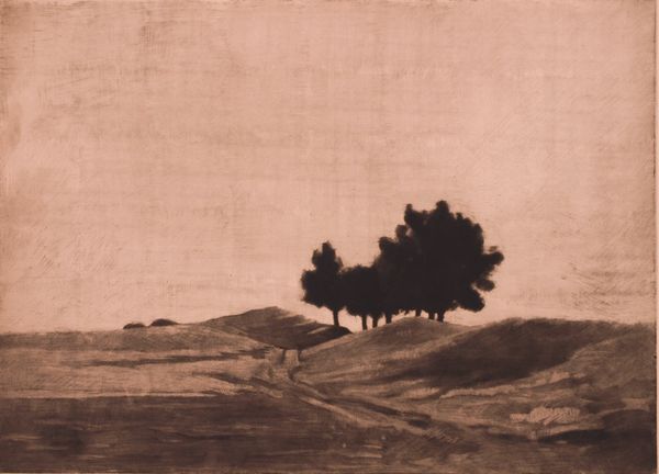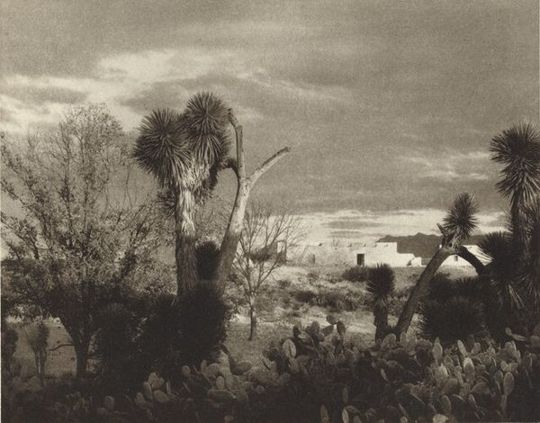 This is a photogravure by Alfred Stieglitz, titled "September." It's a print, made using an early photographic process that allowed for rich tonal range and fine detail. The scene depicts a field with shocks of wheat, their forms softened by the printing process, evoking a hazy, late-summer atmosphere. Now, think about the labor embedded here. Wheat doesn't harvest itself; this image speaks to the intense, physical work of agriculture. The stacks of wheat stand as testaments to human effort, shaped by hands into these temporary forms. Stieglitz presents this labor indirectly, focusing instead on the aesthetic qualities of the landscape, yet the very subject matter brings those questions of production to mind. "September" invites reflection on how we value both the artistic representation and the labor-intensive processes that bring food to our tables. By considering these aspects, we gain a richer understanding of the image.