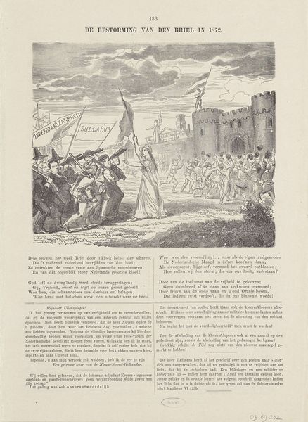 Curator: What strikes me first is how neatly this print is divided. Its composition—with Christopher Columbus taking center stage in the upper register and a view of life in Sengambia occupying the lower register—demonstrates an artist thinking in terms of formal balance and mirroring. Editor: That's an interesting reading, especially considering the work is titled “Amerika. Ontdekt door Christoffel Columbus." Columbus looms large, doesn’t he? Almost comically so. There's an undeniable arrogance communicated through his stance and that bold flag he plants. What’s the date on this print? Curator: While the dates for its creation are documented as between 1894 and 1959, its earlier aesthetic harks back to an almost medieval, or at least pre-modern, flatness of space and form. The lines are crisp and unyielding. Editor: Knowing that, it feels charged with the politics of its era—the colonial gaze romanticizing this "discovery" while simultaneously juxtaposing it with an equally stereotyped depiction of Senegalese life. It’s a jarring exercise in power dynamics. Look at how the Indigenous people are presented almost as a welcoming committee! The framing is far from neutral. Curator: Perhaps. But I am curious about the ornamental vine border that encircles the composition; there is an integration of distinctly non-Western organic forms at play there. Editor: True, it creates a decorative effect. However, it almost seems to contain the scenes within—as if reinforcing a specific, controlled narrative for viewers of the time. There's an element of staged exoticism here that's hard to ignore, particularly regarding these portrayals of "America" and "Senegambia." It serves, ultimately, as visual propaganda. Curator: I see what you mean. Despite the appealing clarity and balance, understanding the historical context certainly exposes the work's latent ideologies. Editor: Precisely. Recognizing the "where" and "when" helps unlock so much more than merely analyzing brushstrokes or, in this case, the printmaking technique. Curator: Fair enough. Looking at this from both a formalist and activist angle does give it so much more dimension. Editor: Exactly! It highlights how intertwined art always is with history and power.