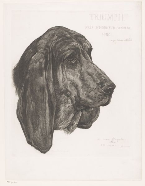 Curator: Look at the palpable mood captured here! It is melancholy I think. Editor: Today we’re observing "Hondenkop met een halsband met ring", which translates to "Dog's Head with a Collar and Ring". Johannes Mock created this work around 1825. The artwork resides here, at the Rijksmuseum. Curator: Yes, melancholy for sure. Do you feel the constraints implied by the ring and collar? The sitter here is less an individual and more a symbol of subjugation, class and gender roles projected onto the animal other. Editor: It's striking how Mock uses only pencil to capture such detail, from the glint in the dog's eye to the texture of its fur. The circular hatching behind the head provides subtle contrast. Semiotically, we read the controlled, deliberate strokes as markers of technical skill. Curator: Technical skill that serves ideological frameworks! The domestic sphere during the early 19th century placed emphasis on obedience and control of bodies deemed “domestic”, be it dogs, or enslaved people and indentured servants, or women. I'm interested in the societal attitudes embedded in representing this animal so restrained. Editor: Interesting to read the artwork through the lens of the "domestic sphere" especially because the composition emphasizes the head alone. Consider how that formal choice encourages intense scrutiny, directing us to read the details as signifiers. The collar could even suggest belonging and care. Curator: Perhaps…but even “care” can manifest itself through controlling practices. This era of emerging industrialization saw rigid systems that placed constraints on marginalized groups and the poor, as they were further surveilled and disciplined to comply with hegemonic norms and values. The way in which we perceive this canine could reflect those power structures and cultural anxieties. Editor: And isn’t that how artworks survive, adapt, and are re-born throughout history: they become cultural prisms, reflecting the tenor of the times and enabling discourse. Curator: I couldn't agree more, particularly as these discussions compel us to reckon with our place in ongoing historical narratives.